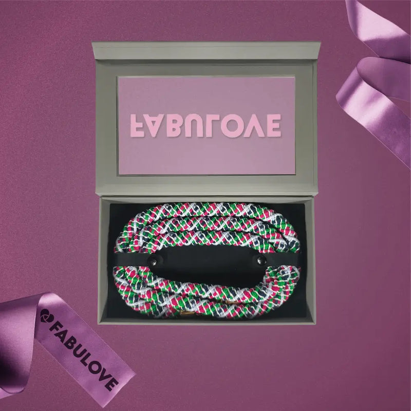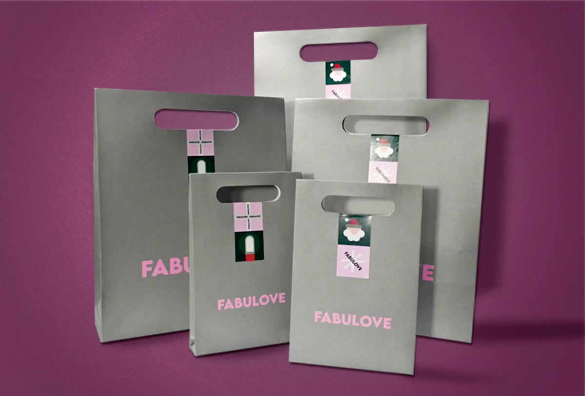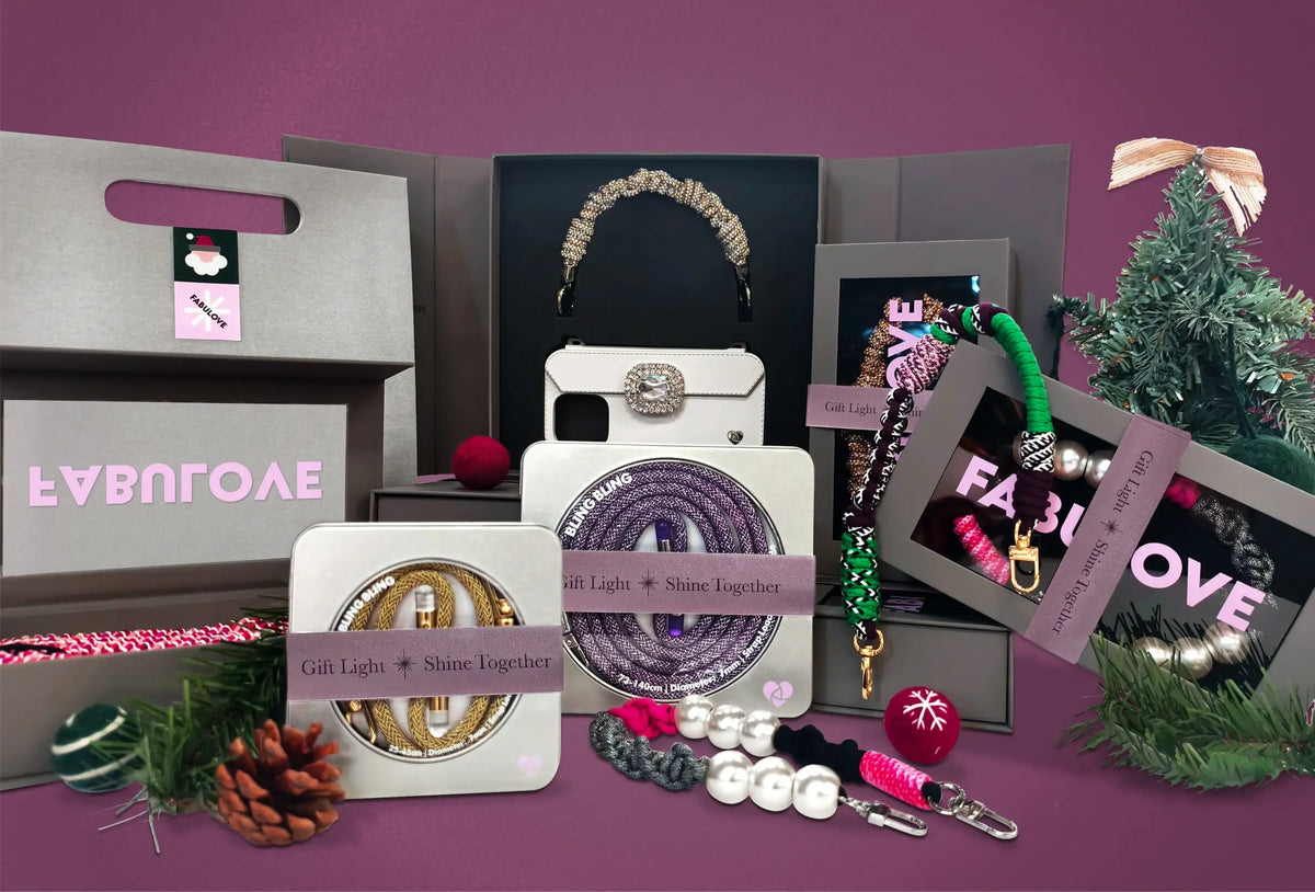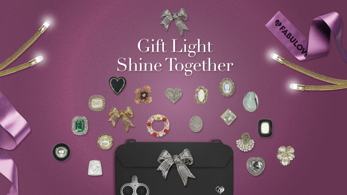 "Gift Light, Shine together” ribbon wrap, FABULOVE shopper bag and Limited Holiday Edition stickers